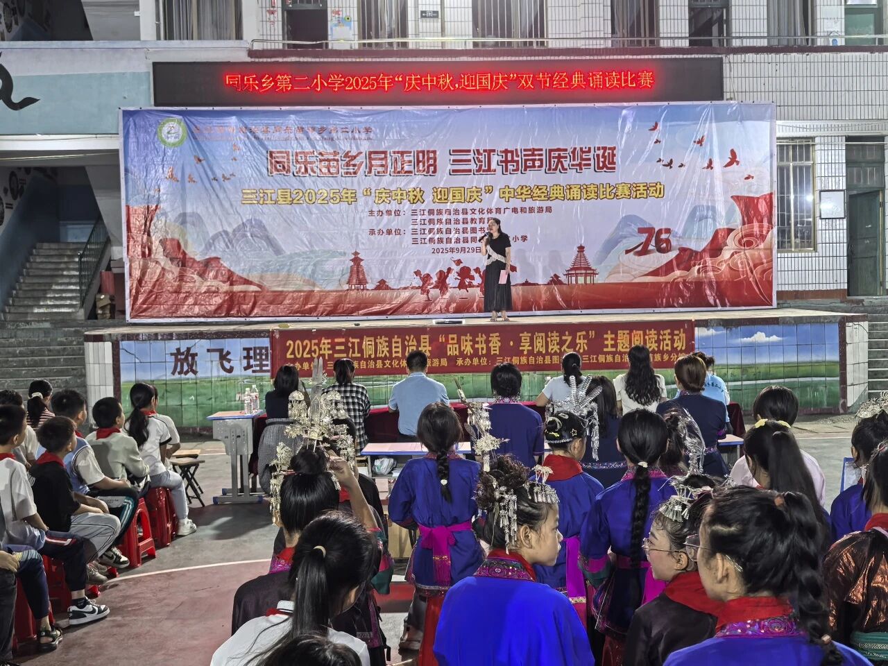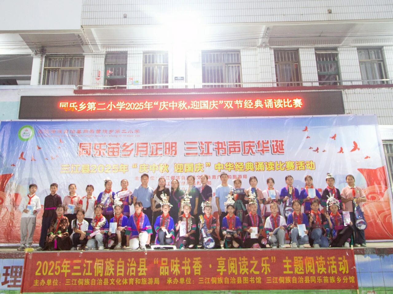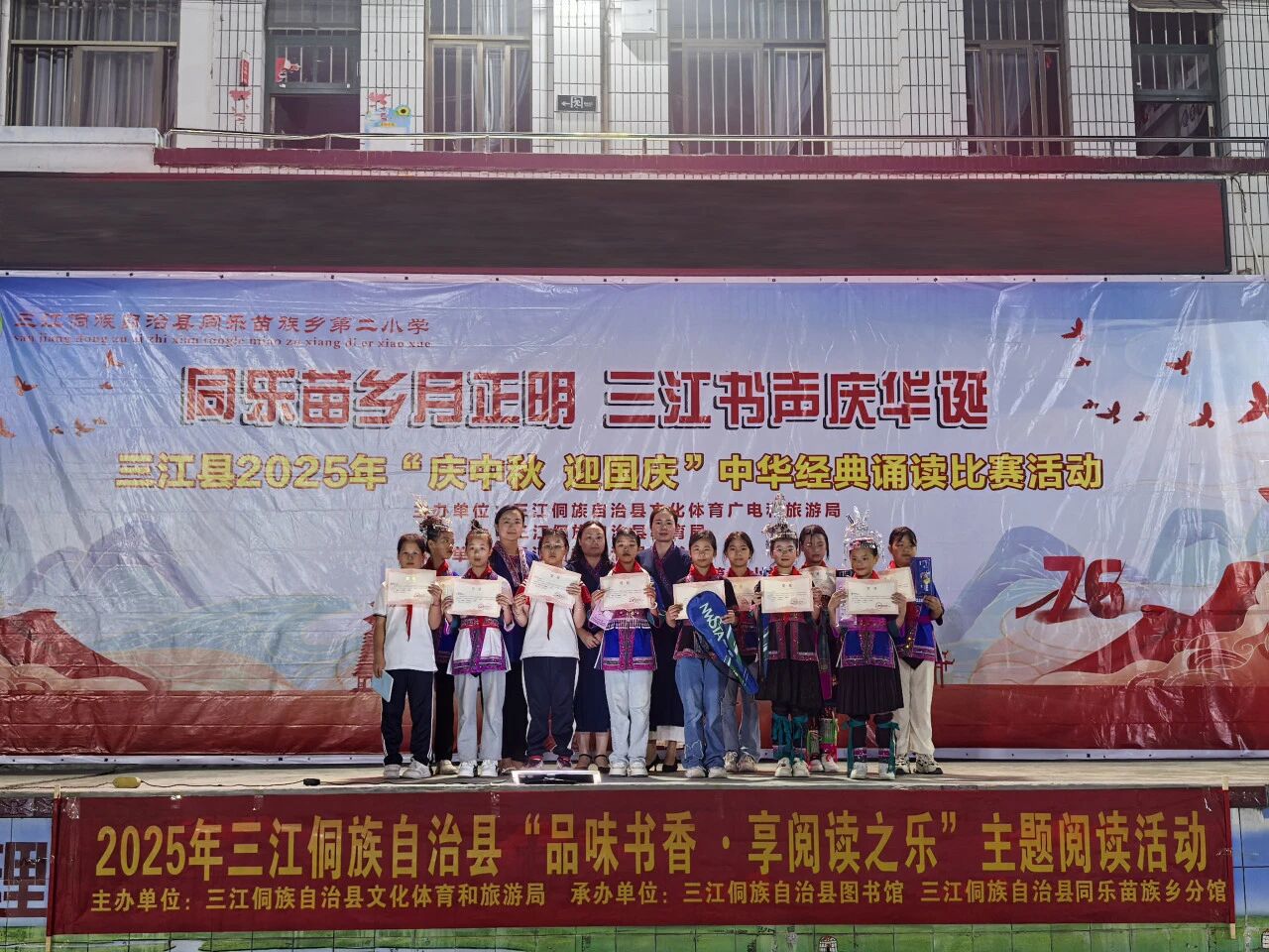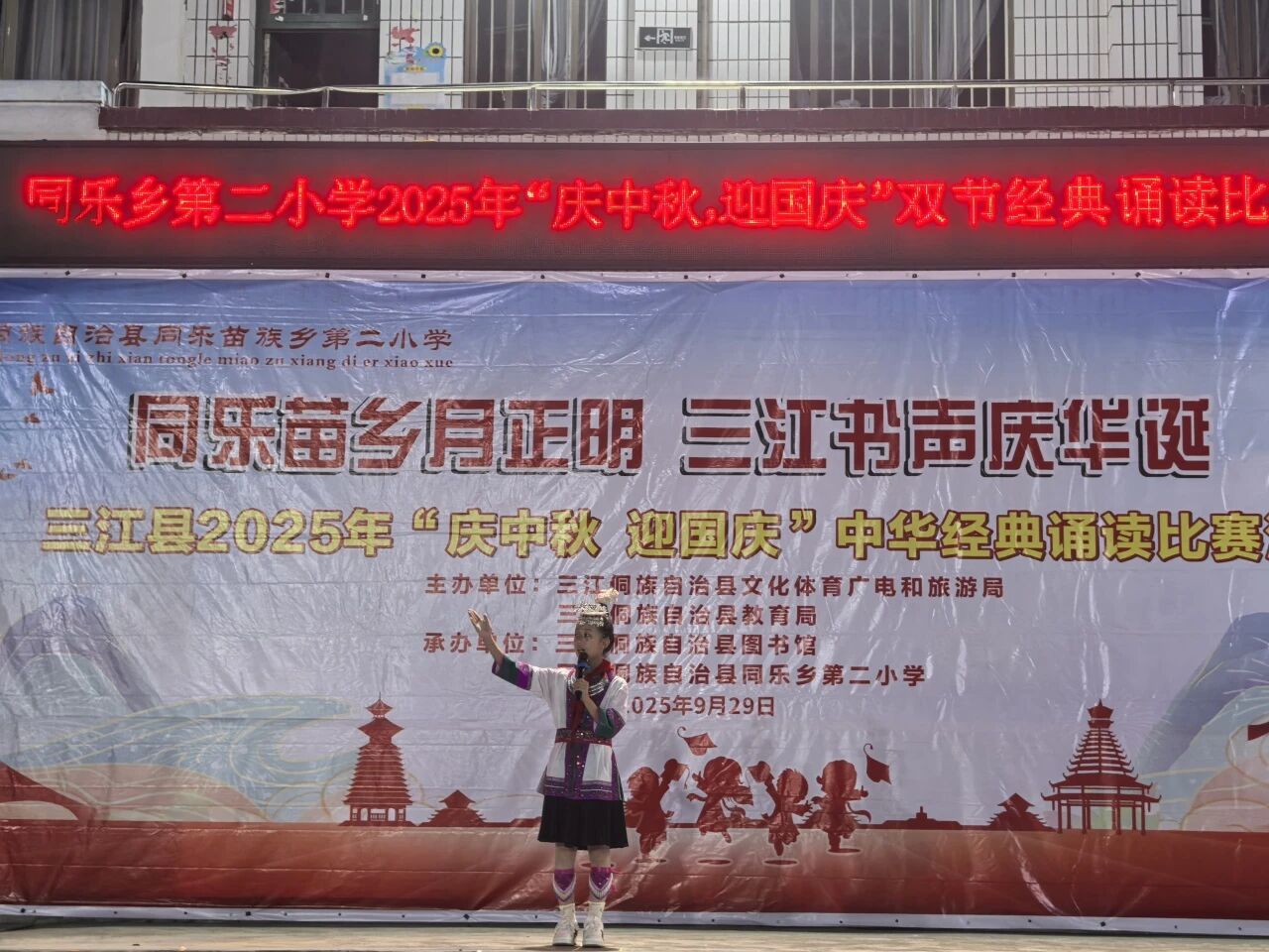 秋光潋滟,月圆人和。在2025年中秋与国庆双节相继来临的美好时节,由三江侗族自治县文体广旅局、教育局主办,县图书馆携手富禄苗族乡纯德小学、同乐乡第二小学承办的“庆中秋,迎国庆”中华经典诵读比赛,于9月28日、29日分别在两校成功举行,为金色的秋天增添了一抹浓郁的书香与家国情怀。