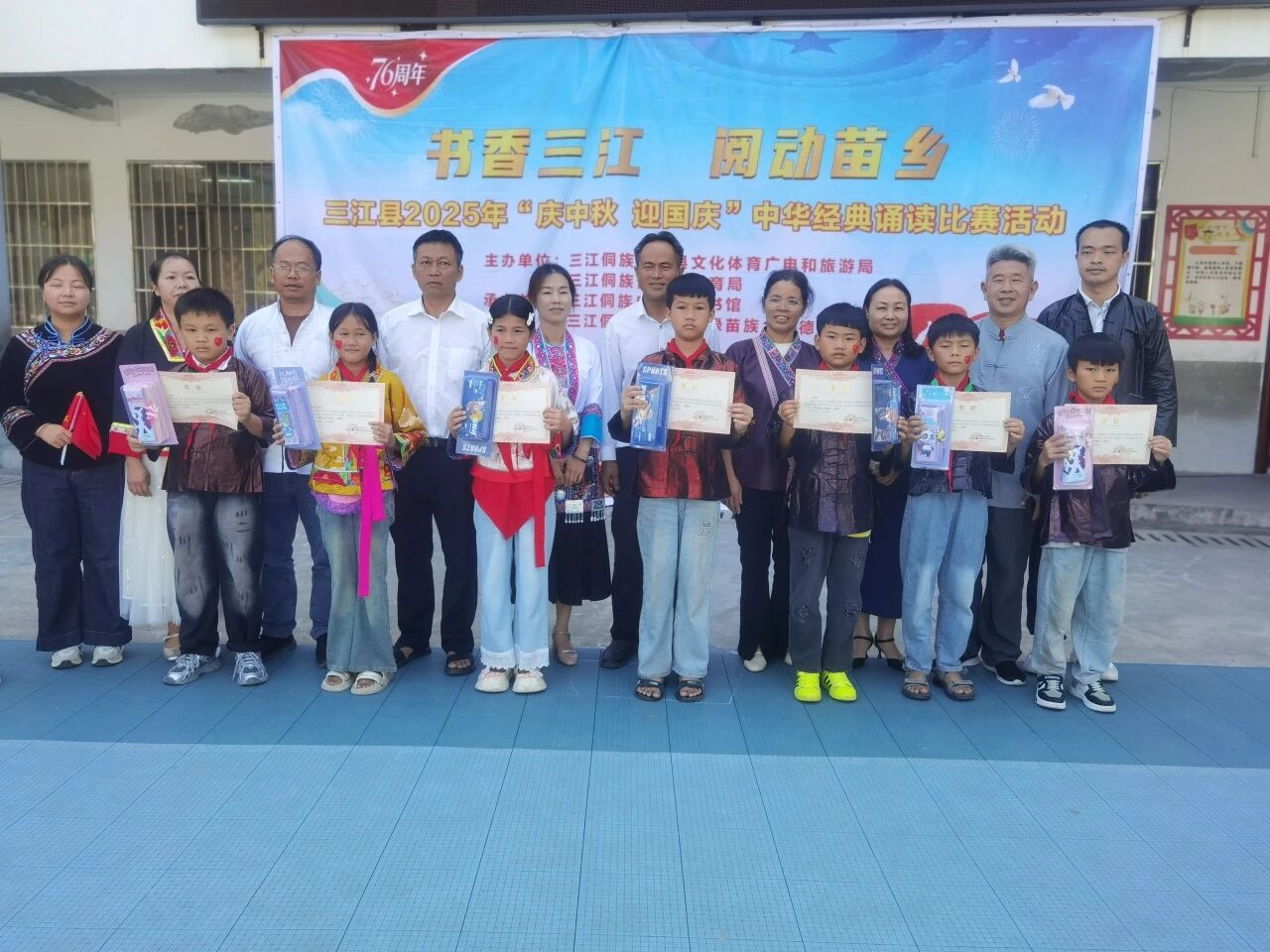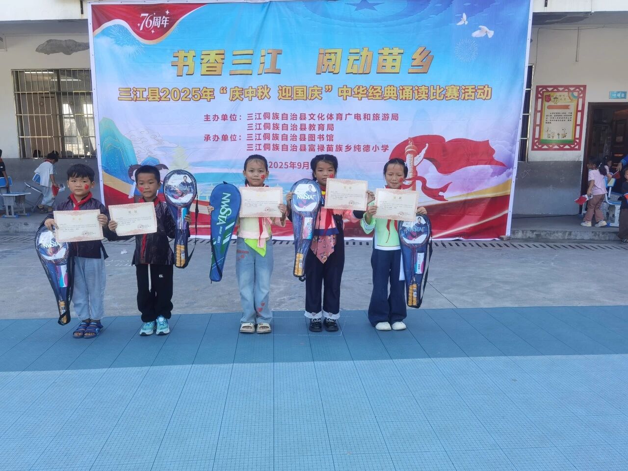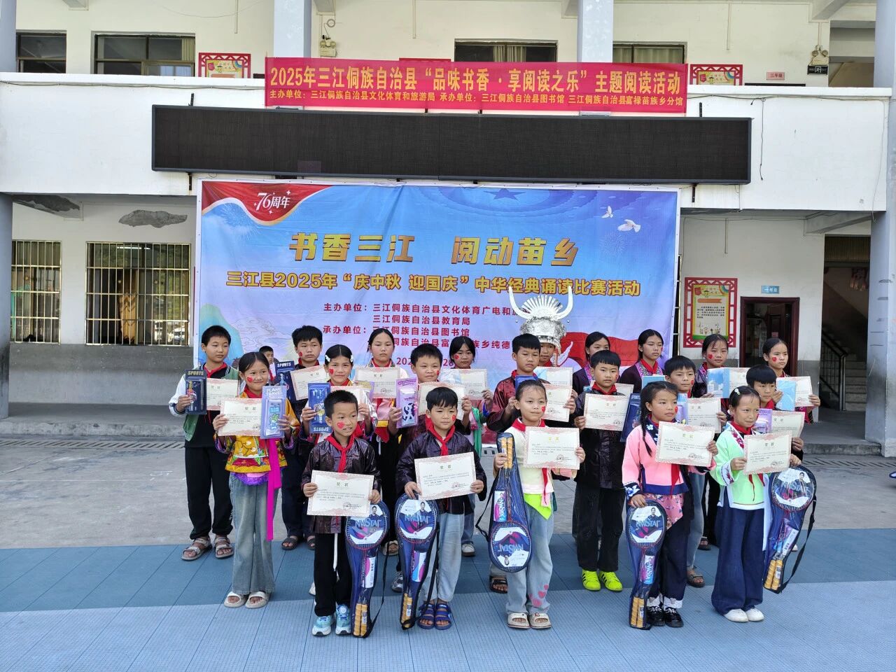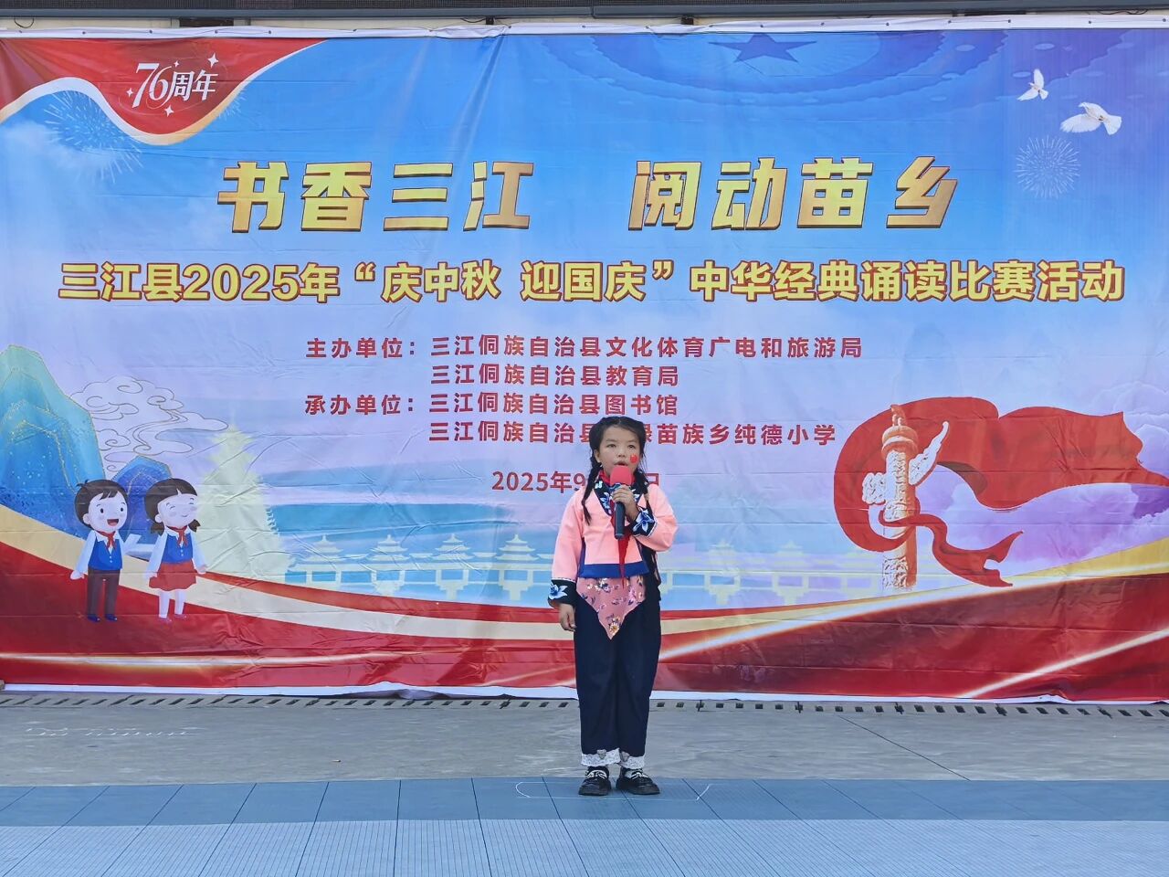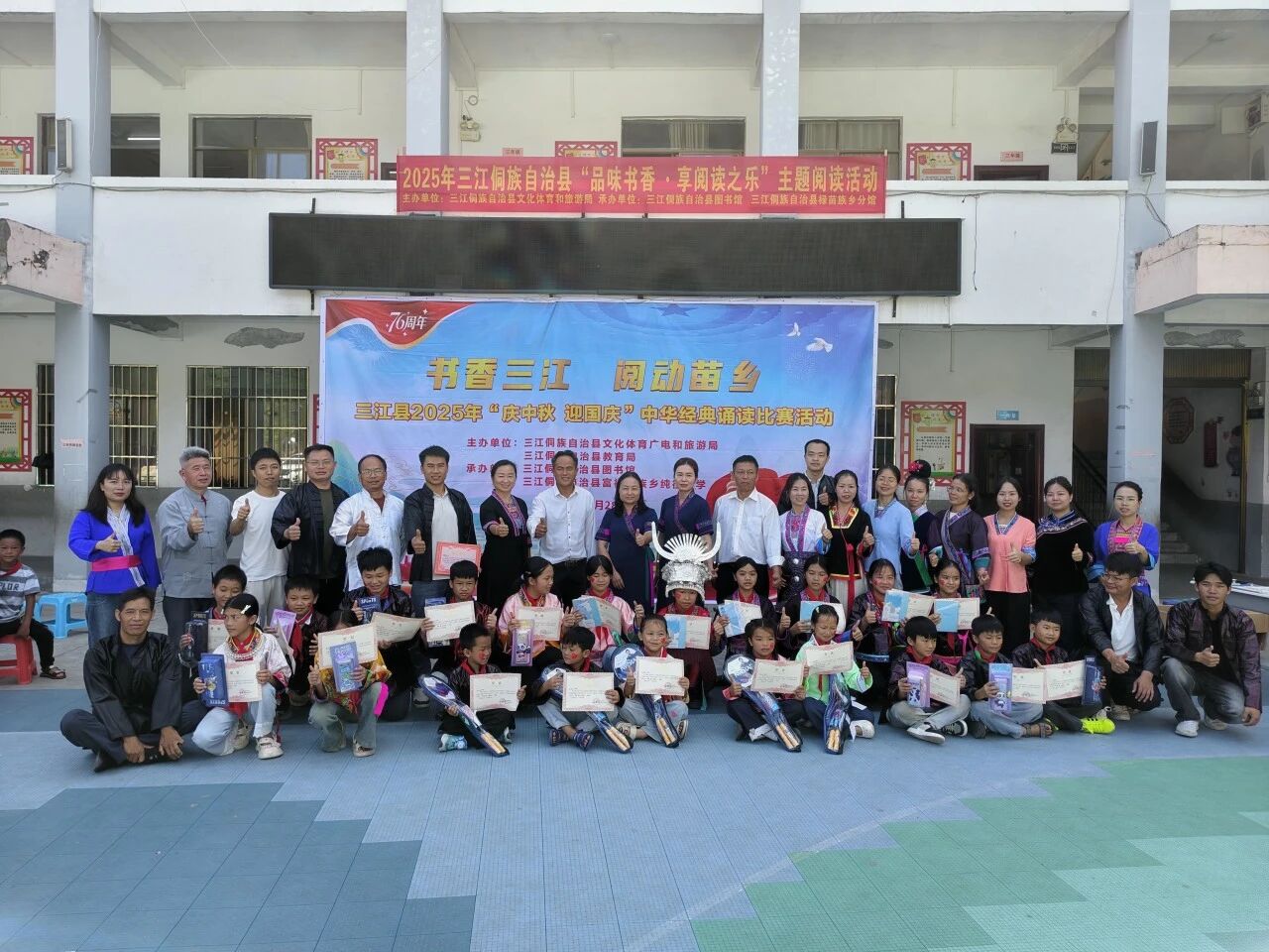 秋光潋滟,月圆人和。在2025年中秋与国庆双节相继来临的美好时节,由三江侗族自治县文体广旅局、教育局主办,县图书馆携手富禄苗族乡纯德小学、同乐乡第二小学承办的“庆中秋,迎国庆”中华经典诵读比赛,于9月28日、29日分别在两校成功举行,为金色的秋天增添了一抹浓郁的书香与家国情怀。
