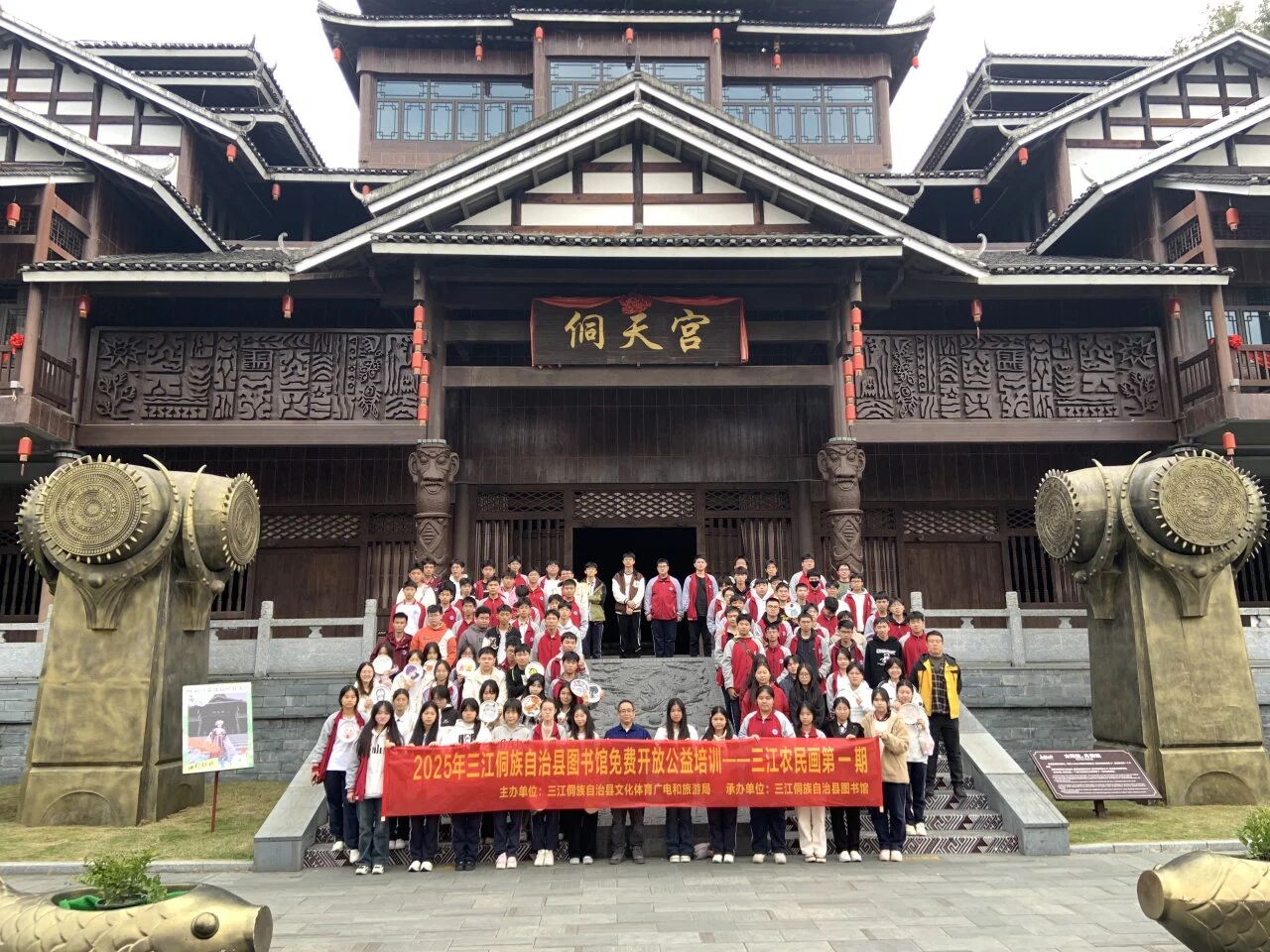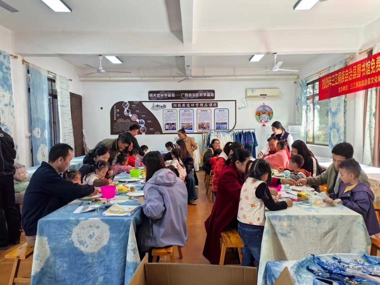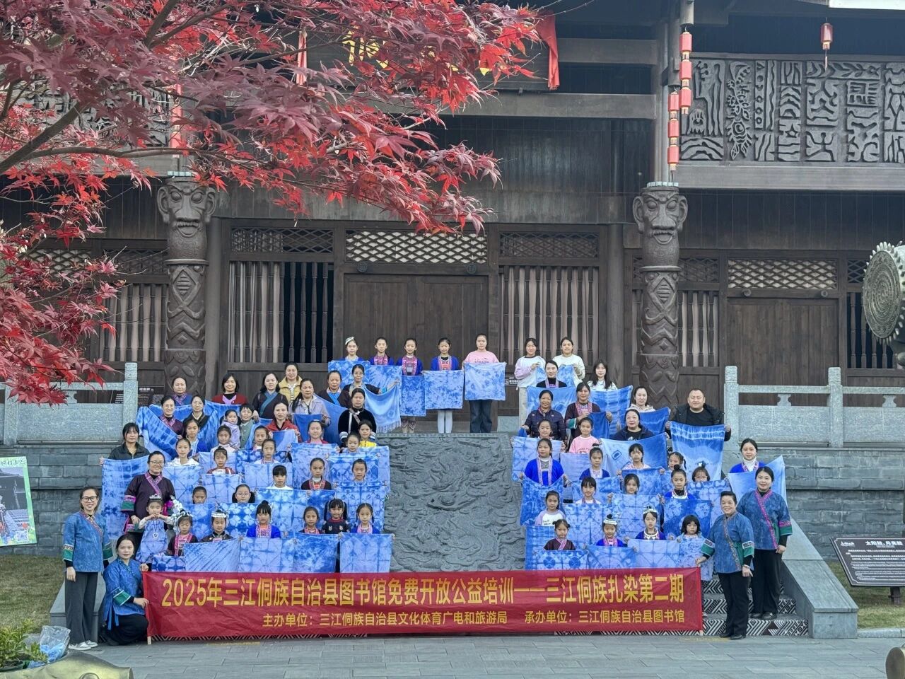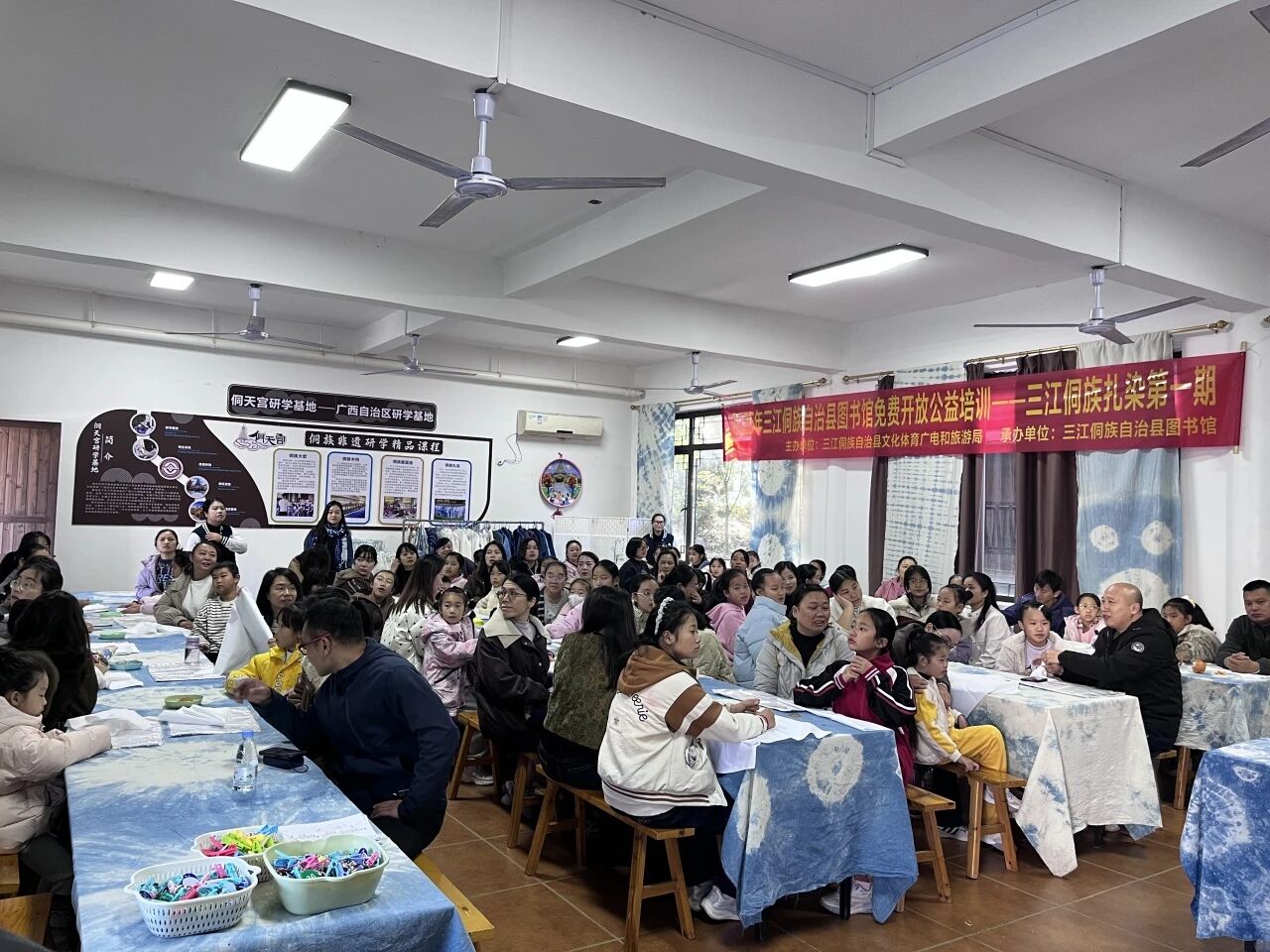 除了精彩纷呈的比赛,11月期间,县图书馆在侗天宫开展了六期三江农民画和侗族扎染培训,吸引了众多中小学生与大学研学学生参与。培训中,当地知名农民画家与专业扎染艺人倾囊相授,从理论知识讲解到实操技能指导,孩子们深入了解传统技艺的历史文化背景,亲手体验绘画工具使用、色彩搭配、扎花、浸染等流程,独立完成了属于自己的文创作品。作品展示环节,孩子们分享创作心得,在交流中深化对民族文化的认知,成为传统文化的传承者与推广者。