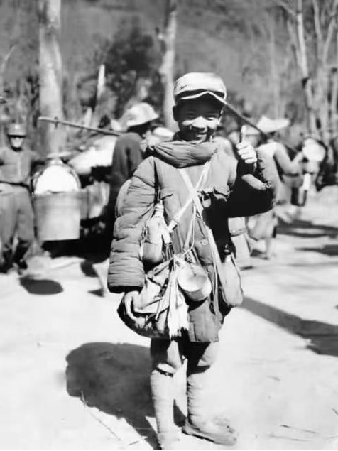 照片中,经美军训练并装备的少年士兵正在行军。他们能够在战斗中担任正规部队的角色。此刻,正规军正从广西柳州地区对日军进行追击。照片中这个抱着双臂的少年正和大部队一起行进,紧紧追赶着前方的敌人。