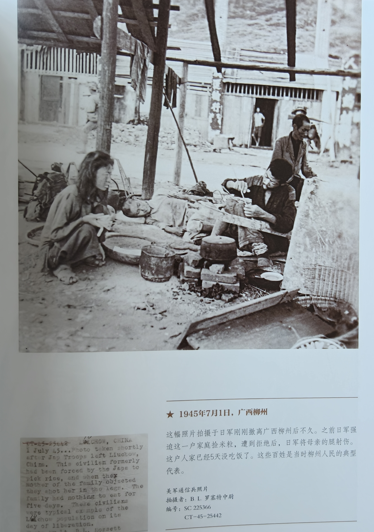 这幅照片拍摄于日军刚刚撤离广西柳州后不久。之前日军强迫这一户家庭捡米粒(编者按:该书将原英文备注“pick rice”翻译为“捡米粒”,应译为“收割稻谷”),遭到拒绝后,日军将母亲的腿射伤。这户人家已经5天没吃饭了。这些百姓是当时柳州人民的典型代表。
