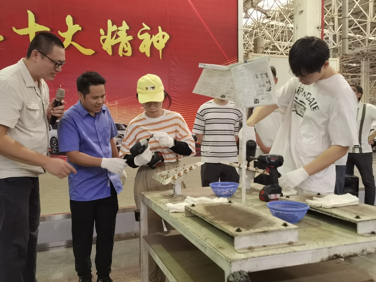 体验精益 匠心铸魂 “走读广西 工业立柳”活动走进东风柳汽 活动首站来到东风柳州汽车有限公司,在乘用车基地生产现场,读者和馆员一行参观风行星海、菱智品牌等系列车型,了解新能源汽车、传统汽油汽车的生产装配流程。在东风柳汽研发楼一楼展厅,大家探寻东风柳汽70年奋斗史,感受柳州工业从无到有、由弱到强的辉煌发展历程。读者和馆员还在现场亲身体验拧螺丝这一基础工艺,从拧紧一颗小小的螺丝钉中深刻体会中国制造的“工匠精神”。 馆员在师傅讲解示范下体验拧螺丝