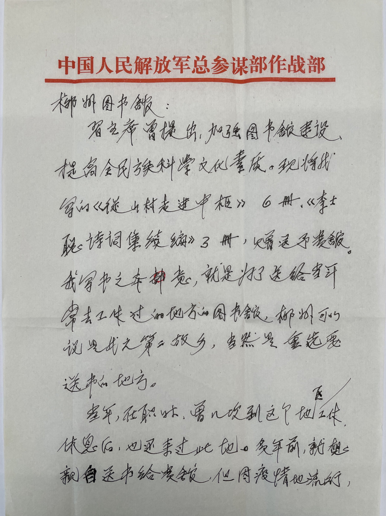 抗美援朝老战士捐赠图书 其中回忆录详实记录其战斗和工作经历,诗词作品饱含对祖国与战友的赤诚情怀,均为极具史料价值与精神内涵的个人著作。 这位年逾九旬的抗美援朝老战士因年事已高未能亲临,但其在委托捐赠信中动情地表示,柳州堪称“第二故乡”,将作品赠予柳州图书馆,是了却已久的心愿。 ▲图为抗美援朝老战士亲笔委托捐赠信