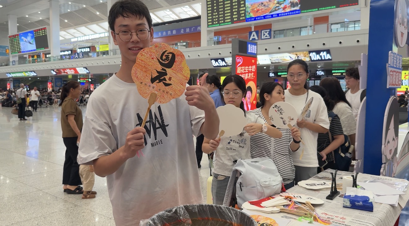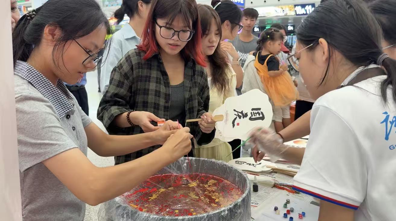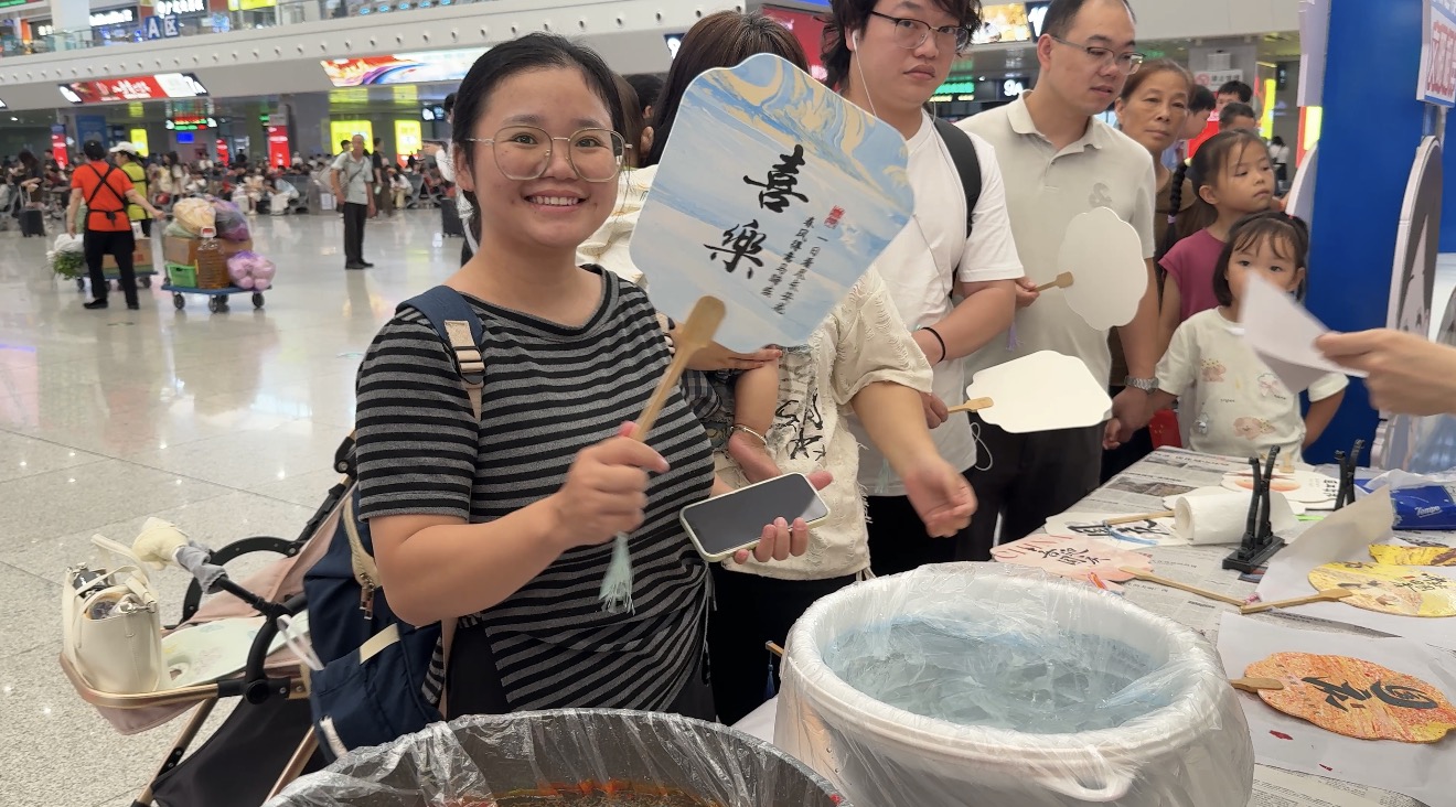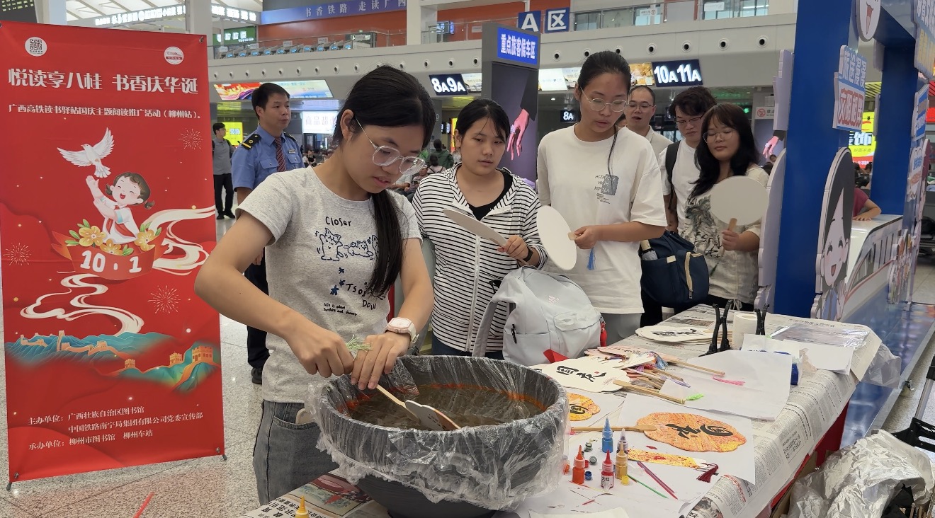 漆扇制作 二层候车厅内,非遗体验区的漆扇制作成为活动的一大亮点,旅客们在图书馆工作人员的引导下,利用国庆中秋主题漆扇和书签等手工材料,染印上五彩缤纷的色彩,创造出喜庆而精美的漆扇作品,展现非遗文化的独特魅力。
