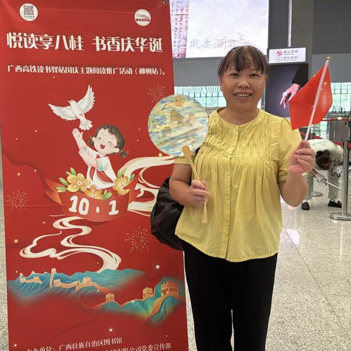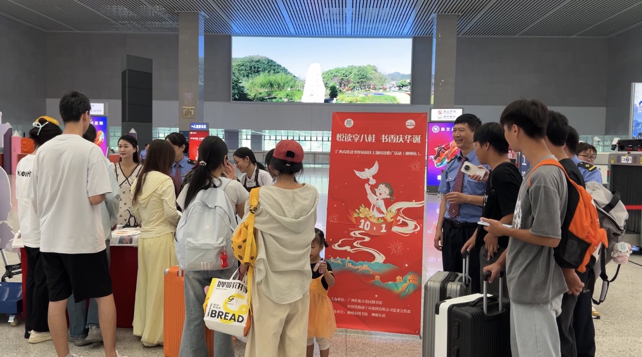 阅读体验环节同样精彩纷呈。旅客们通过扫码参加“中秋启智趣,国庆闯雄关”线上阅读挑战赛。大家在答题闯关的过程中,积极思考,踊跃答题,沉浸在知识的海洋中,享受着阅读带来的乐趣。读书驿站内,图书馆员及志愿者们现场指导旅客办理借书证、注册账号,详细介绍借阅图书的流程以及电子借阅机和“书香铁路 走读广西”小程序的使用方法。旅客们在亲身体验中感受到了书香旅途的便利与愉悦,完成借阅体验的旅客还领取了精美的图书馆文创纪念礼品,收获满满的节日祝福。