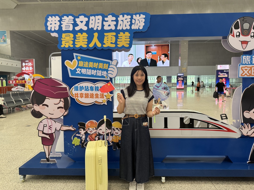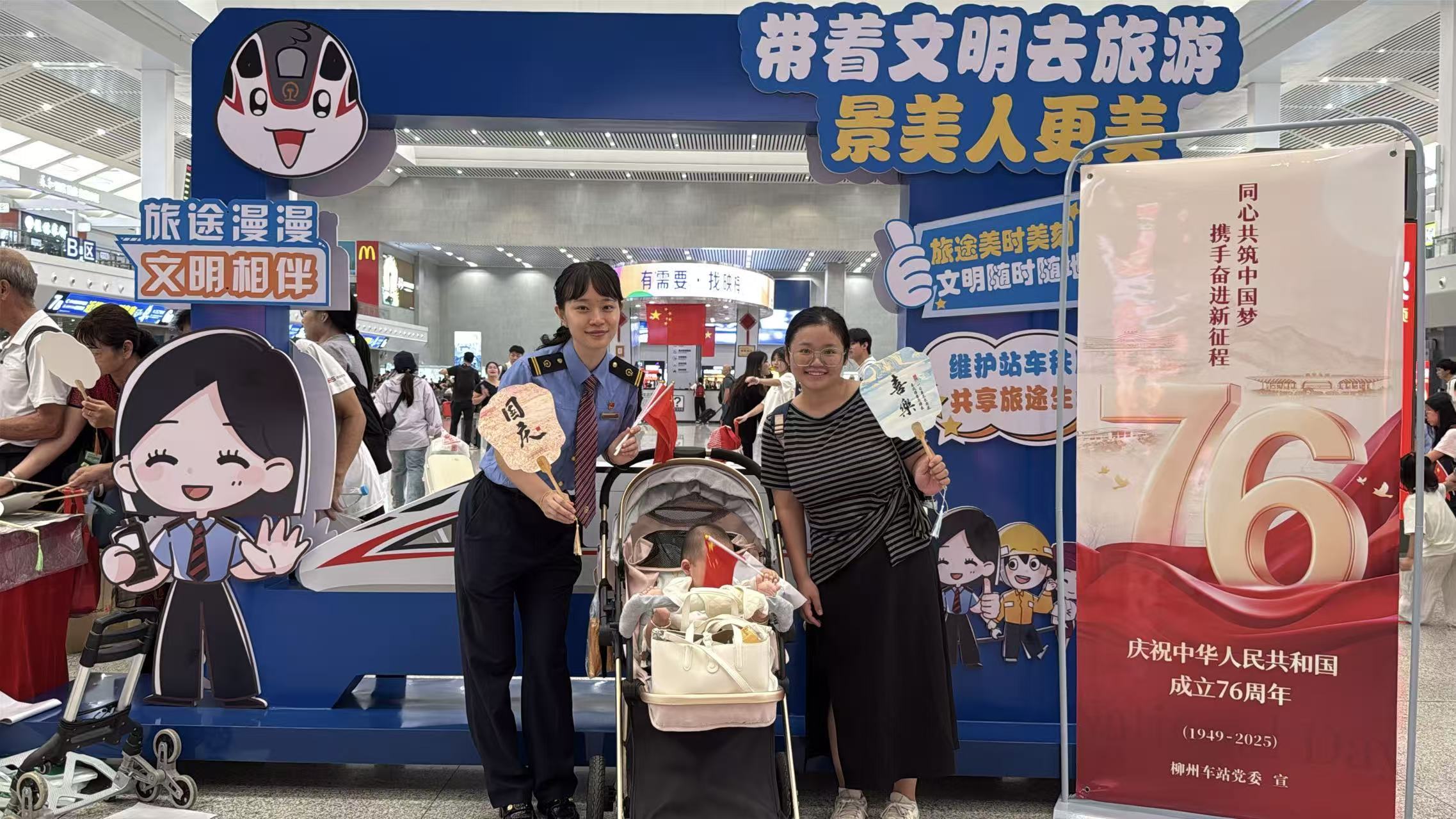 “我和国旗合个影”活动更是将现场气氛推向了高潮。火车站工作人员向过往旅客发放小国旗,引导他们在车站文明出行打卡框前合影,以此定格国庆旅途风采,弘扬爱国主义精神,倡导文明出行新风尚。
