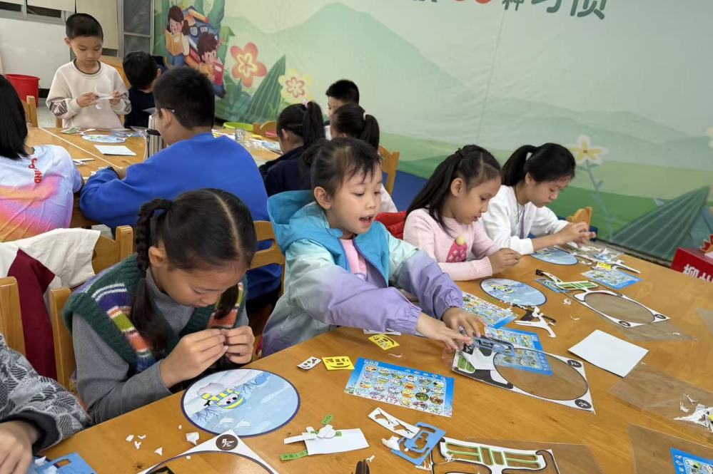 在手工DIY环节,孩子们动手制作了“古诗词不织布立冬贴画”。大家用不织布精心制作出雪人、雪地小屋、飞鸟等冬日元素,并巧妙融入白居易《问刘十九》的经典诗句。活动不仅让孩子们在动手协作中感受到立冬的节气氛围,更将古典诗词与手工艺术创造性结合。让大家在创作中品味古人笔下的冬日意趣,实现了对节气文化与诗词之美的双重传承,让传统文化在快乐的创作中深深扎根于心。