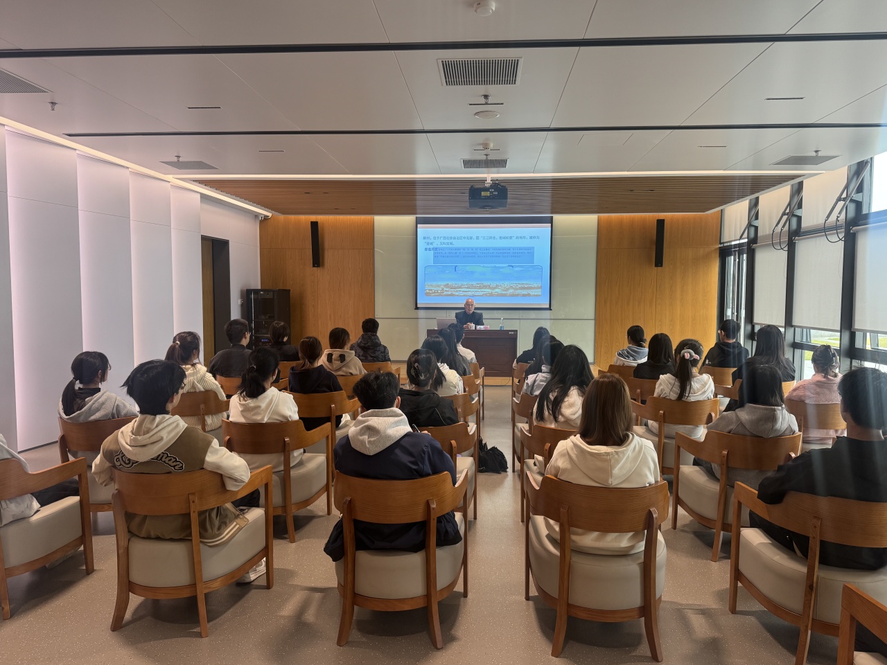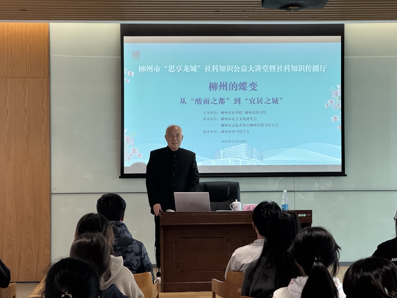 近日,柳州市社会科学界联合会与柳州图书馆联合主办的“思享龙城”社科知识公益大讲堂暨社科知识传播厅活动在柳州图书馆柳东馆举办。活动特邀柳州市老干部党校老书记宣讲员、柳北区关工委常务副主任、柳州市孔子文化研究会常务副会长孔正定老师,以柳州蝶变为主题,为来自广西科技大学的学子讲述柳州从“酸雨之都”到“宜居之城”的华丽转身故事,让他们穿越柳州的发展历史,感受新时代柳州发展的新风貌。