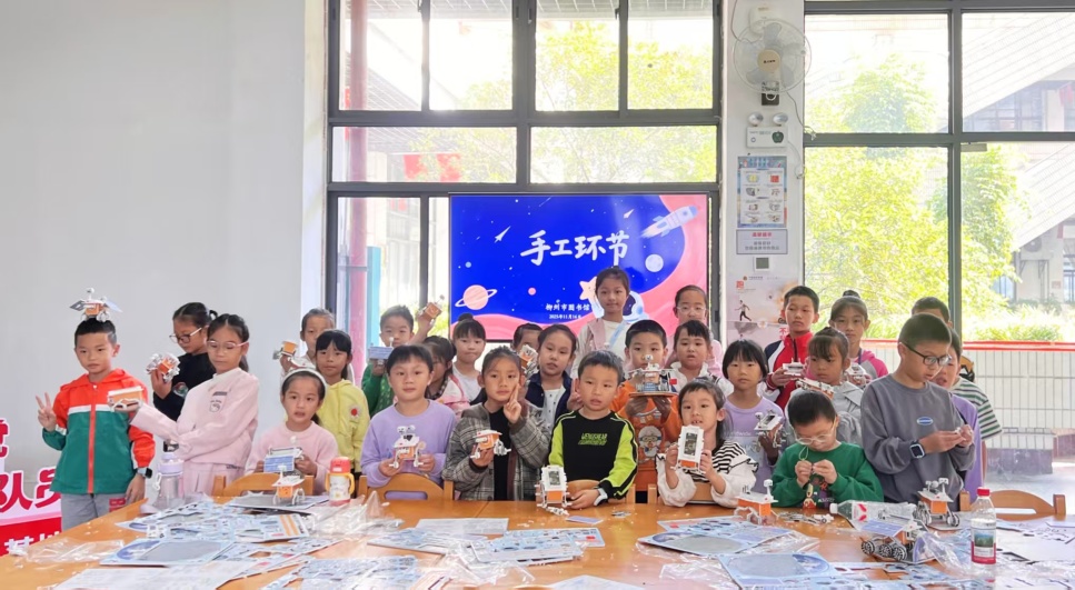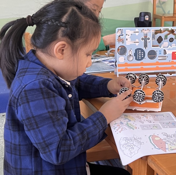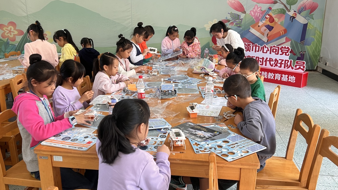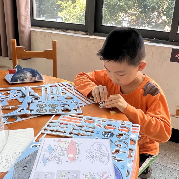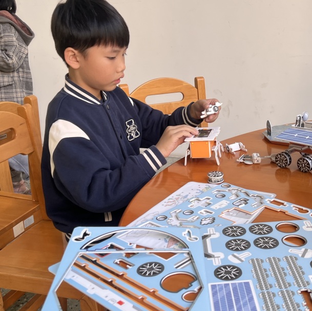 最令人期待的手工制作环节——“玉兔号”月球车模型拼装,将现场气氛推向高潮。在馆员老师和文化志愿者的协助下,孩子们化身“小小航天工程师”,亲手组装属于自己的“玉兔号”模型。大家认真对照图纸,拆解零件、仔细拼装、小心翼翼地粘贴太阳能板……不一会儿,一辆辆精致的“玉兔号”月球车模型在孩子们手中诞生。通过亲手制作,孩子们不仅体验到动手创造的乐趣,也深刻体会到航天器设计的精密与航天事业背后的艰辛。