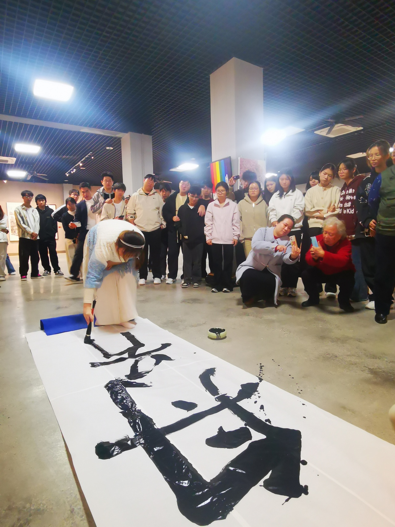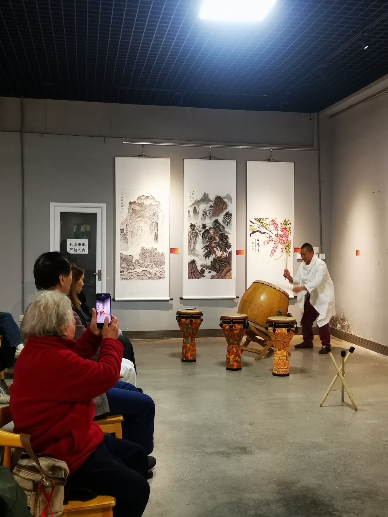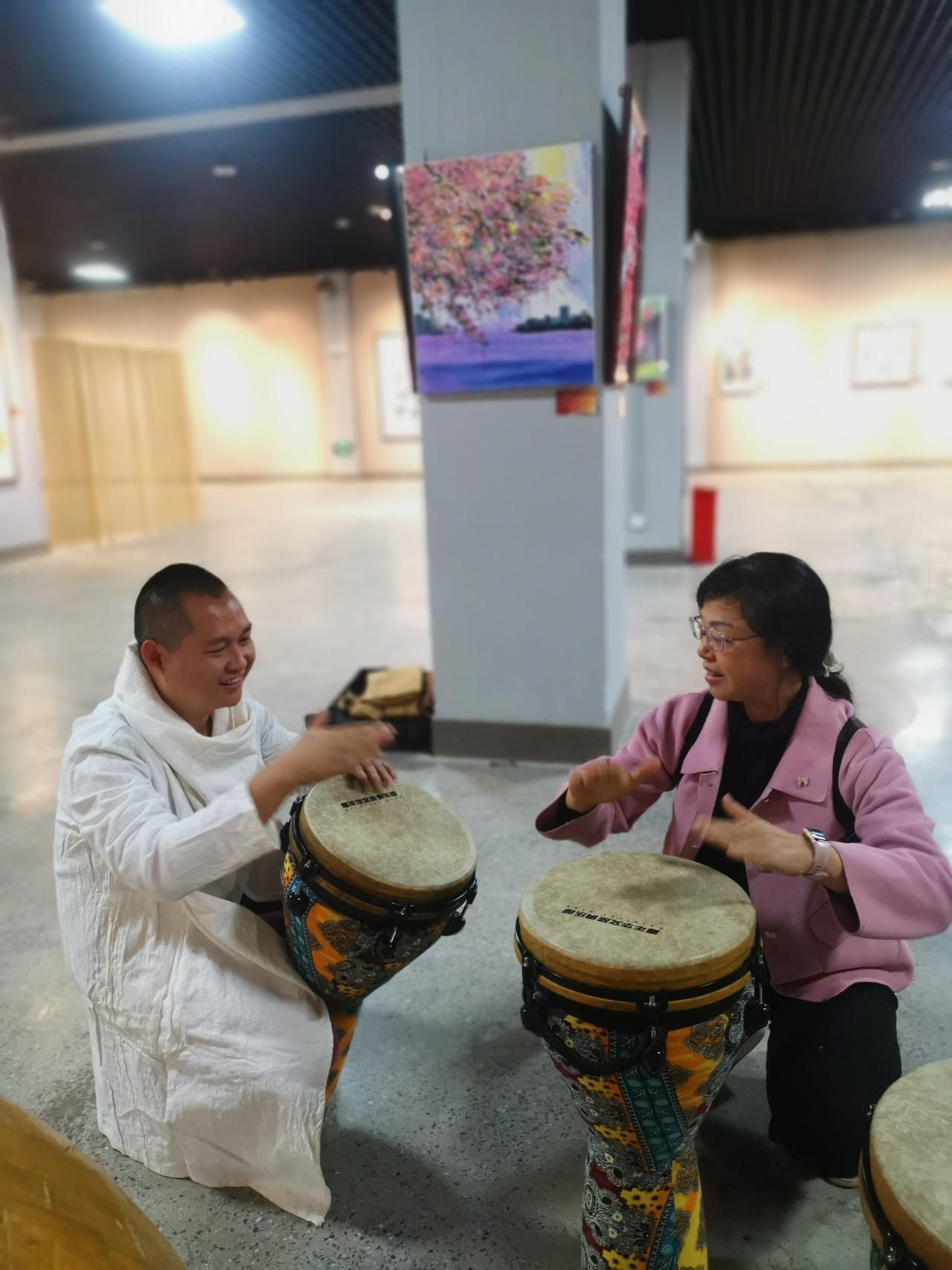 最后,李文老师还分享了书法笔触轻重缓急与节奏的关联,以及广西铜鼓、新疆手鼓等地域鼓文化特色。现场设置互动体验,邀请观众上台演奏乐器,在亲身创作中感受节奏魅力与传统艺术韵味。