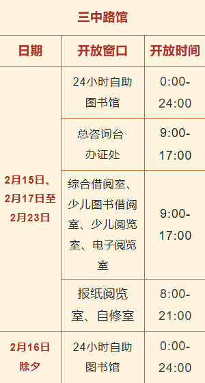 2026年国家法定春节假期放假时间为2月15日至2月23日,共九天。柳州市图书馆柳东馆、三中路馆春节假期2月15日、2月17日至2月23日均正常开放,2月16日(除夕)整理内务闭馆。
