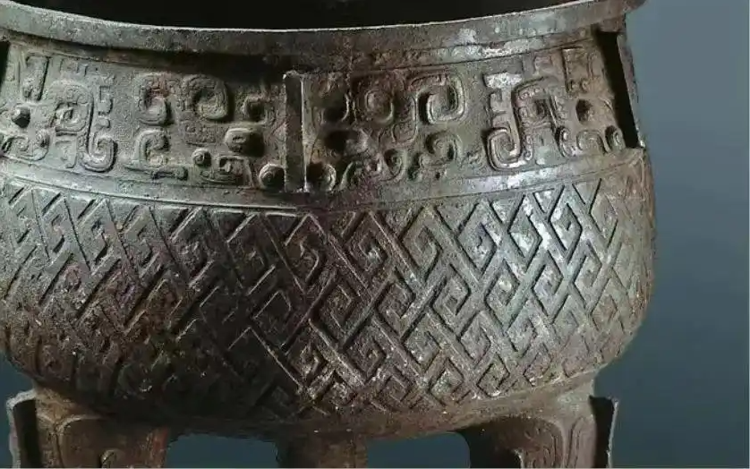 云雷纹是连续回旋几何纹样的合称——圆弧形“卷旋之形”为云纹,方折角“回旋之声”为雷纹(亦似古“雷”字),是商周青铜器 “三层花”中常见的地纹。