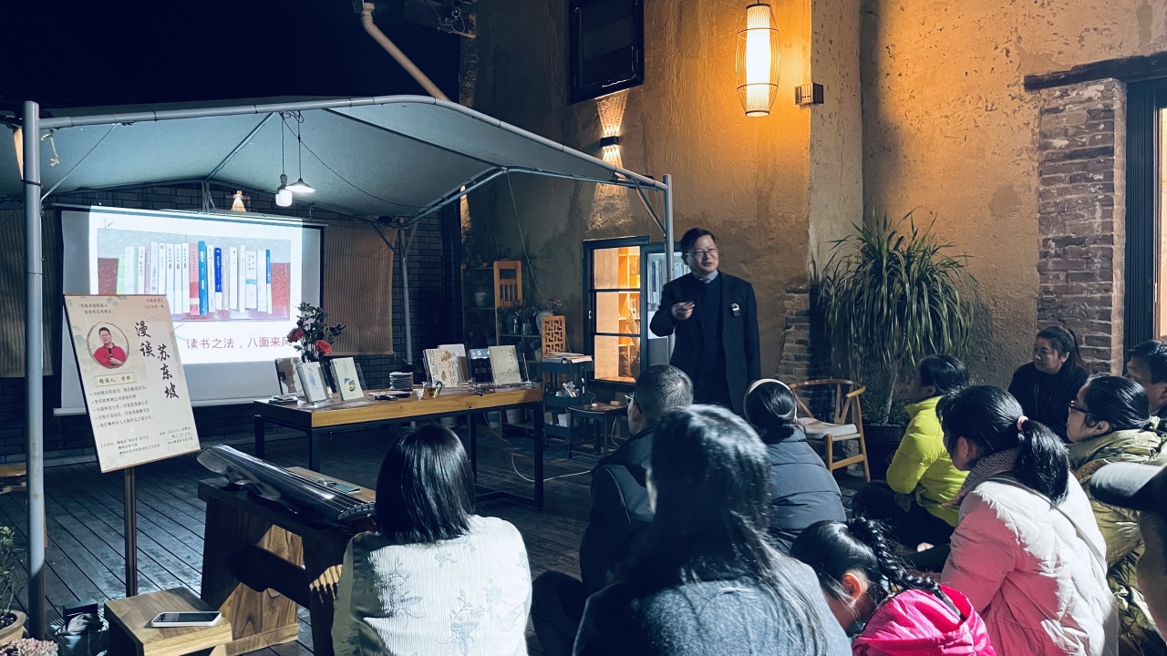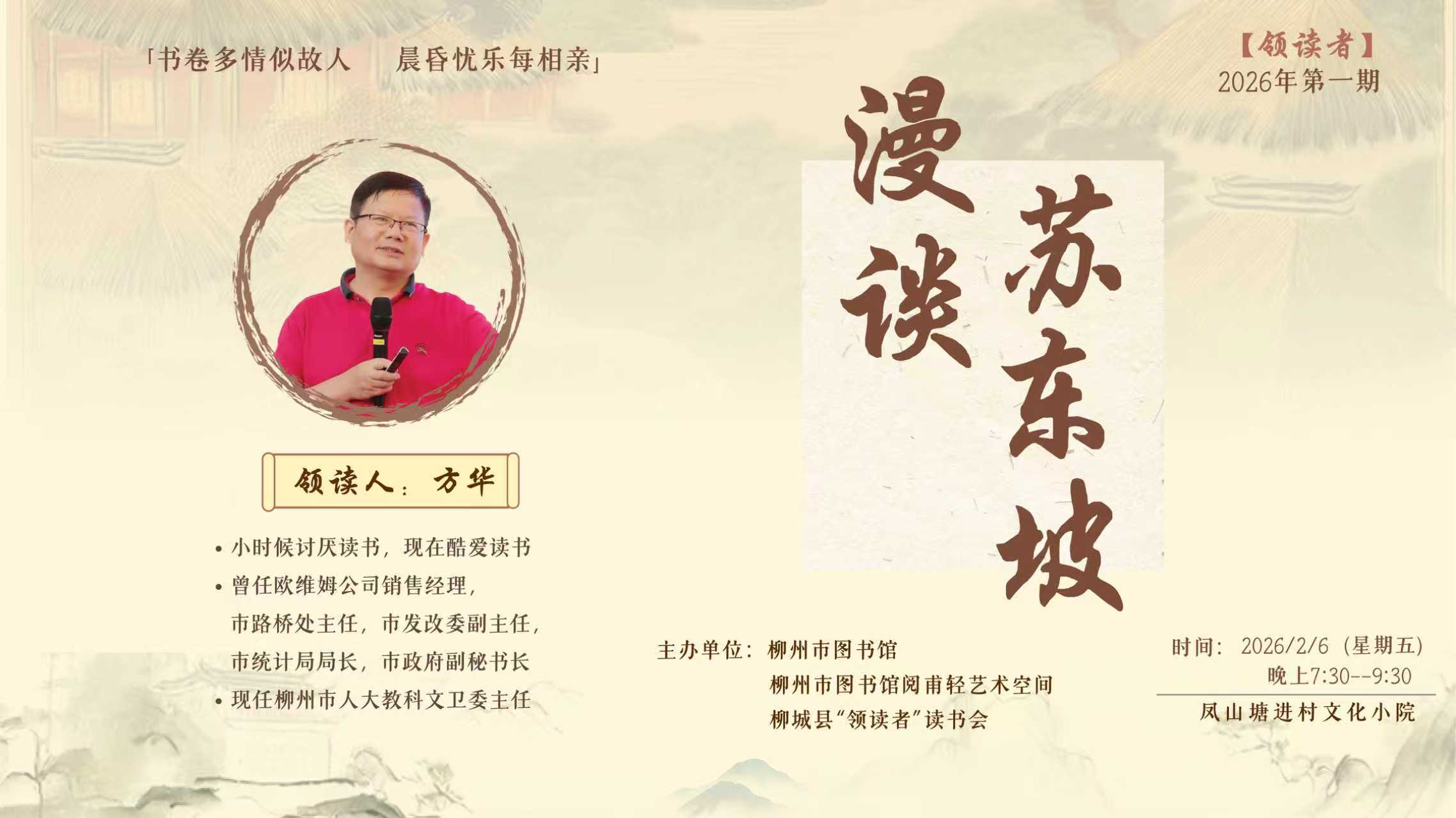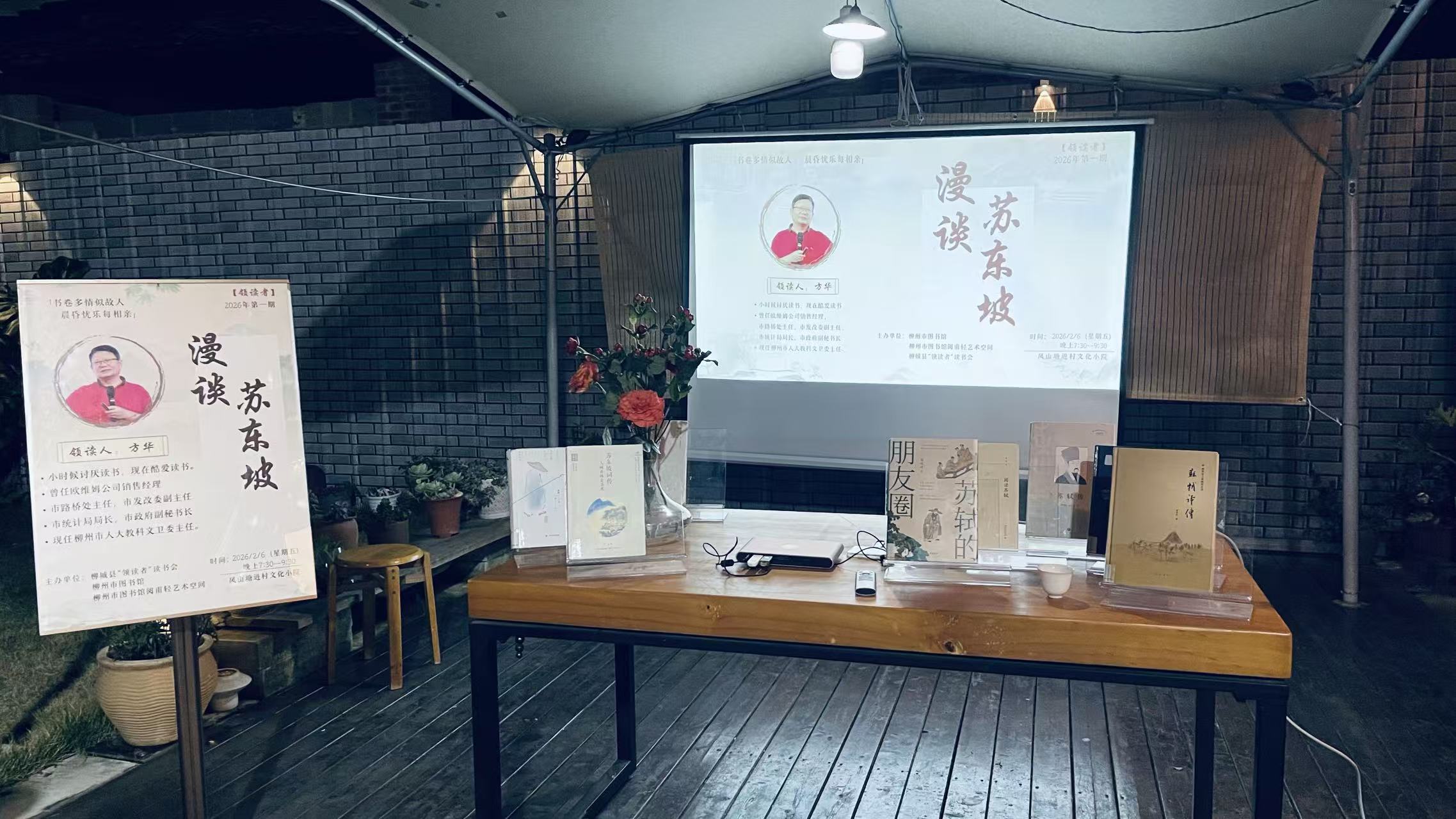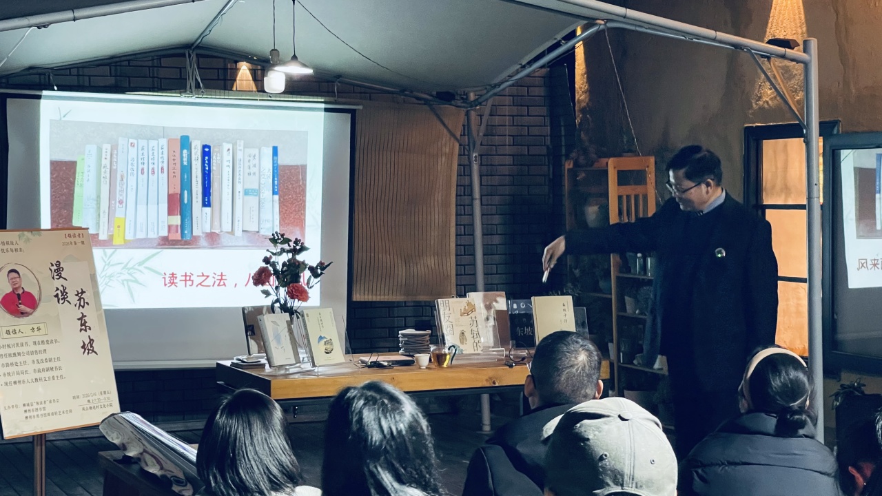 2月6日晚,柳州市图书馆联合阅甫轻艺术空间、柳城县“领读者”读书会,在柳城县凤山塘进村文化小院成功举办2026年“领读者”读书分享会第一期活动。活动邀请柳州市人大教科文卫主任方华主讲《漫谈苏东坡》,柳州市区、柳城县两地阅读爱好者30余人齐聚一堂,共赴书香之约。