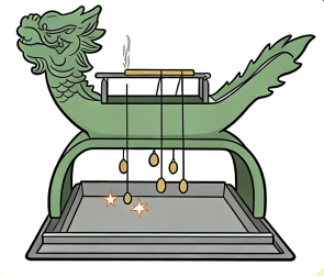 这是由更香做的“闹钟”。在更香需要断裂表示时间处悬挂小金属球,香燃烧到这个地方,烧断绳子,金属球就会掉到下方的金属盘子里。掉落的响声就像闹钟一样,提醒人们某个时间点到了。