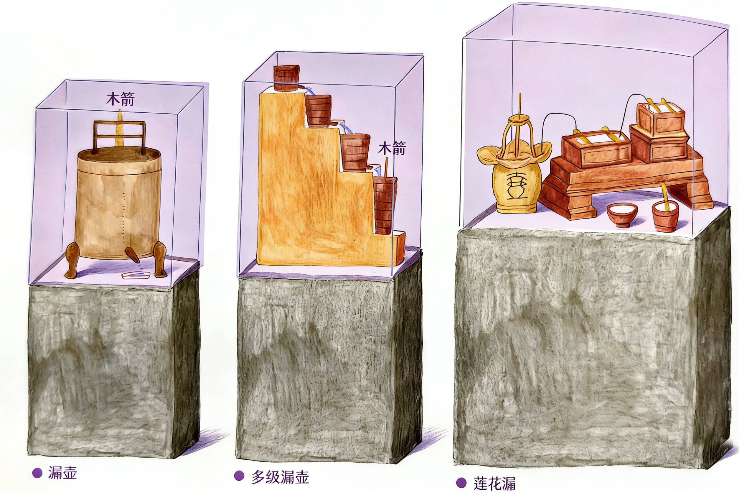 如果太阳落山了,或是阴雨天,该怎么知晓时间呢?人们把目光转向了水,开始利用有小孔漏水的漏壶来记录时间。
