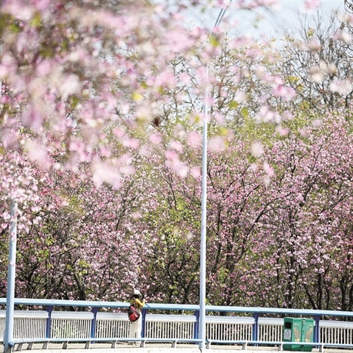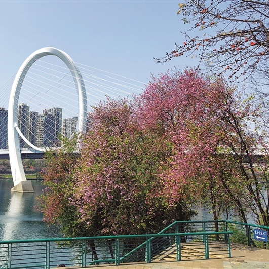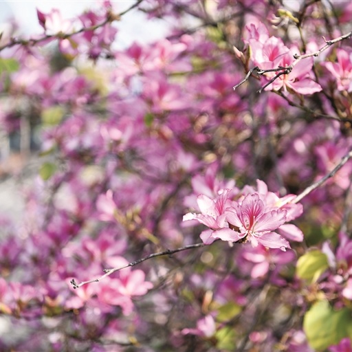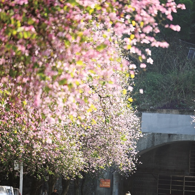 微风拂过,洋紫荆灿若云霞,粉白相间之间绘成龙城如诗如画的春日盛景。