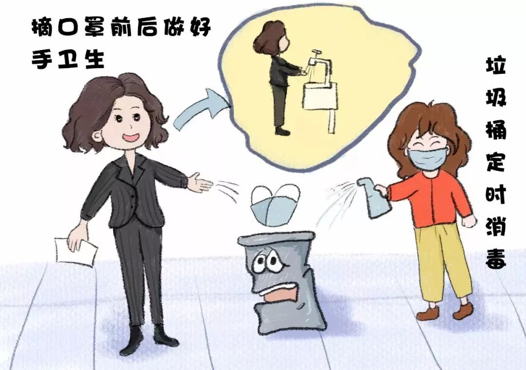 防疫期间,摘口罩前后做好手卫生,废弃口罩放入垃圾桶内,每天两次使用75%酒精或含氯消毒剂对垃圾桶进行消毒处理。