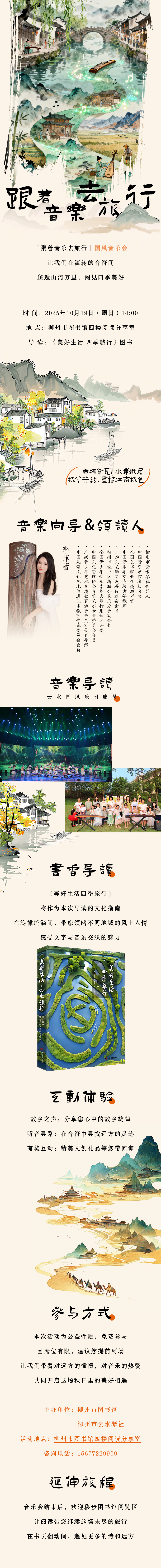 馆员荐书 《美好生活 四季旅行》 著者:《美好生活·四季旅行》栏目组 出版社: 当代世界出版社 索书号:K928.9/8042 馆藏地点: [柳东馆] 6F主专题阅览区 [三中馆] 2F综合借阅室 本书为大型文化旅游类视频栏目《美好生活·四季旅行》同名图书。编委会根据季节顺序和行政区划,对该栏目第一季“春天摄影大赛”和第二季“华夏好风光”的57部作品进行了精心汇编,力图以优美生动的语言、各具地域特色的景致,为读者呈现出一幅幅山水人文画卷。阅读本书,可纵览祖国山河的壮阔秀美,感受各地景区的人文风情,亦可扫描随文嵌入的二维码,以视频的形式欣赏多维、 丰富、 直观的人间胜境。 《中国人的音乐》 著者: 田青 出版社: 中信出版集团股份有限公司 索书号: J607.2/6050 馆藏地点: [柳东馆] 5F获奖图书展阅区 [三中馆] 2F综合借阅室 中国音乐究竟好在哪儿、美在哪儿?如何代表中国?如何感受各民族民歌的魅力?新音乐的力量在哪里体现?我们中国人有没有自己欣赏音乐的逻辑? 本书通过对中国传统器乐与乐器、民歌与民族声乐、新音乐的讲解,带领读者聆听古筝、古琴、琵琶、二胡等传统乐器的“金声玉振”,走进南音、佛乐、道乐的神秘世界,领略不同地区、不同民族民歌的独特魅力,体会“长亭外,古道边”“一条大河波浪宽”的时代精神,从音乐层面、地缘及历史层面、人文层面,讲述蕴藏在音乐里的民族情感。 《跟着音乐大师去旅行》 著者: 陈立 出版社: 北京大学出版社 索书号: J605.5/7400 馆藏地点: [柳东馆] 5F主题空间 本书源自著名音乐评论家陈立先生在国家大剧院所作的“走进唱片里的世界”系列讲座。作者将视角聚焦于维也纳、布拉格、伦敦、柏林、慕尼黑、萨尔茨堡、威尼斯等世界音乐名城,以充满诗意的语言讲述众多音乐大师的故事,并将各地的历史、文化、建筑和自然风光融入其中,展现出一幅幅充满艺术魅力的异国风情画。书中配有数百幅精美画作和照片,并以二维码附上经典音乐片段。图文并茂,音画交融,邀你共赴一场穿越时空的艺术盛宴。