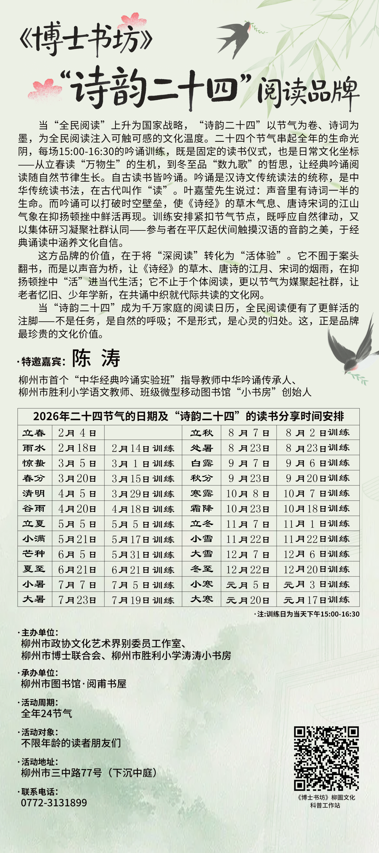 春分已至,昼夜均分,万物在平衡中焕发生机。伴随着春天的脚步,《博士书坊》2026年公益阅读活动——“诗韵二十四节气”已温情启幕。首场“春分”主题吟诵于3月15日(周六)下午15:00-16:30在柳州市图书馆·阅甫书屋圆满落下帷幕。活动以诗词为媒,以声音为桥,带领参与者共赴一场充满诗意的春日之约,为新一年的节气阅读之旅写下美好开篇。